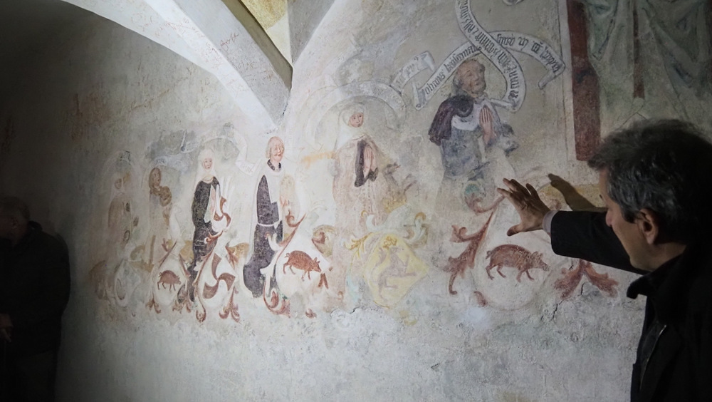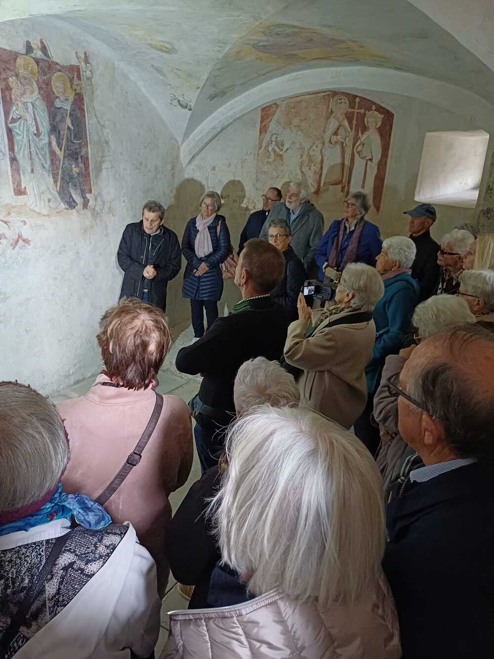 Besonders beeindruckend präsentierte sich auch die Michaelskapelle, wo noch gotische Fresken aus dem 15. Jahrhundert zu sehen sind – darunter eine Darstellung des Erzengels Michael im Jüngsten Gericht, die verschiedene Techniken der Wandmalereien sichtbar macht. Im Gegensatz zu der Sekkomalerei auf trockenem Untergrund wirken die Fresken, bei denen die Farbe auf nassen Putz aufgetragen wird, kräftiger und leuchtend.