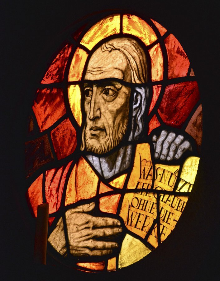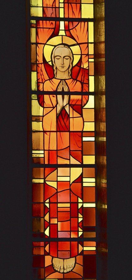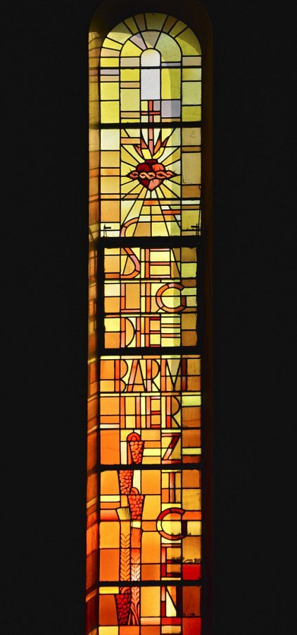 Glasgemälde von Carl Rieder (siehe auch Lustenau) 1934 in den Rundbogenfenstern vier Engel und Symbole der acht Seligkeiten, in den Kreisfenstern des Umganges die 12 Apostel; In der Theresienkapelle fünfteiliges Fenster mit Jesus und Maria, Josef, Kolping und hl. Hildegard, über der Empore Papst Gregor der Große, Papst Pius XI. und Landesbischof; in der Taufkapelle hl. Christophorus, in der Beichtkapelle Verlorener Sohn; in der Sakristei Hll. Johann B. Vianney, Don Bosco und Tharcisius.