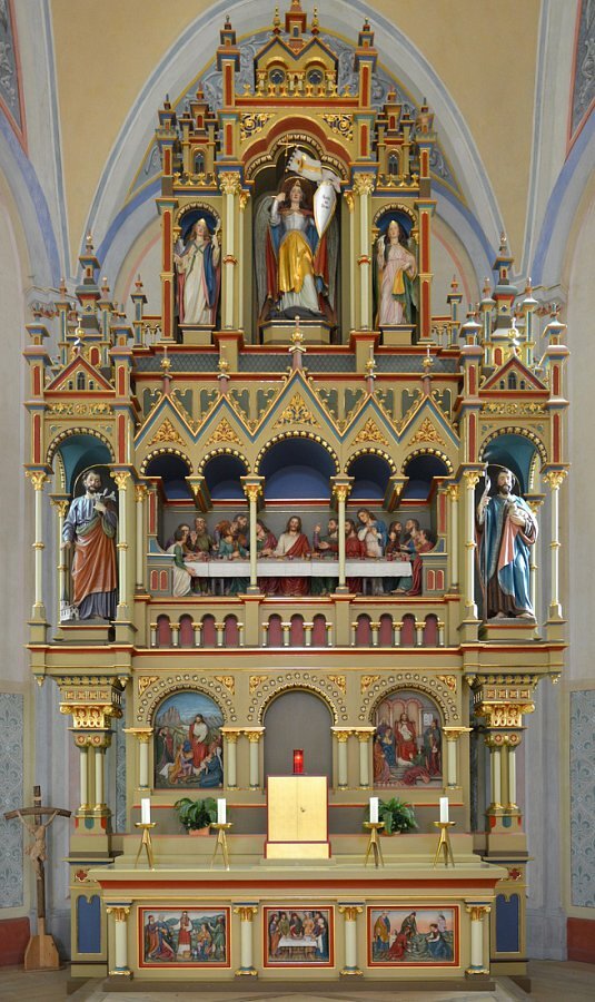 Hochaltar, neuromanischer Aufbau von Jakob Bertle, Abendmahl, 1872